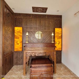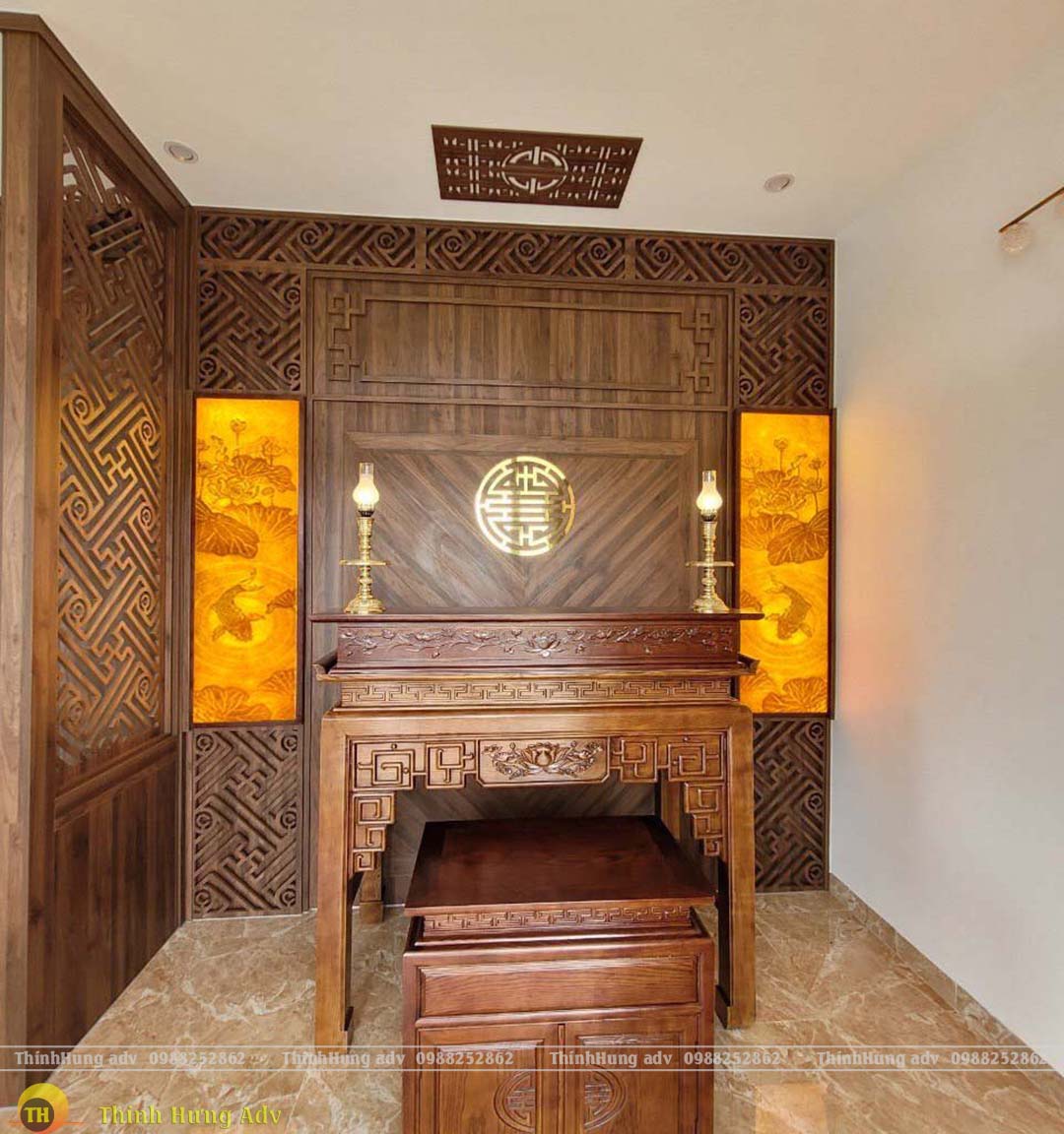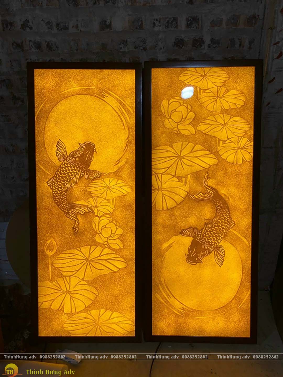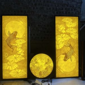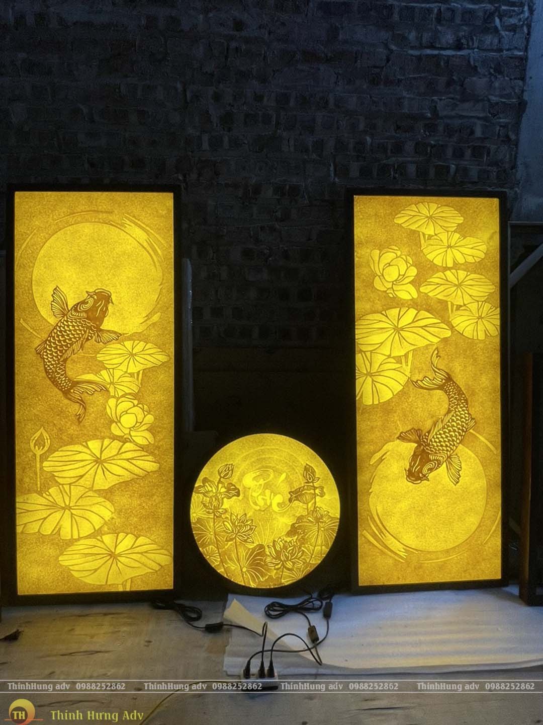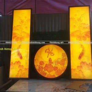 Mẫu tranh trúc chỉ hoa sen cá chép được trau chuốt từng đường nét rất đẹp, sắc sảo và vô cùng tinh tế, đồ họa độc đáo cùng ánh sáng đèn led vàng lung linh tôn lên vẻ đẹp giá trị thẩm mỹ cao không gian Phòng thờ.